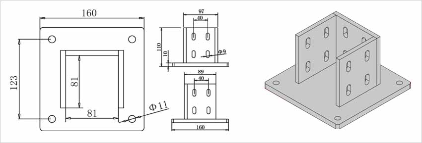 安裝底座特點:防護圍欄安裝底座是根據鋁型材產品規格而開發的一款專用防護圍欄安裝底座,具有很高的強度,可打孔安裝或焊接;